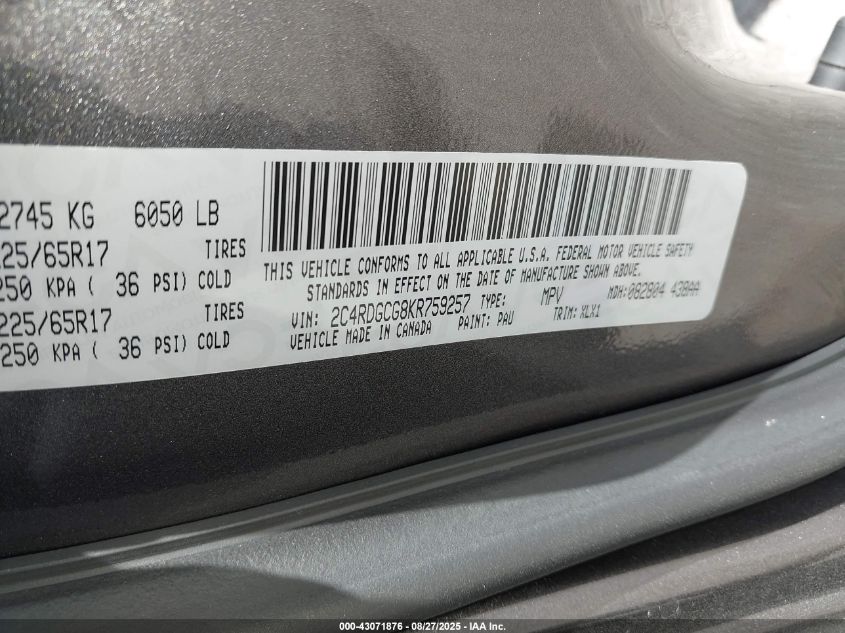 2019 DODGE GRAND CARAVAN 2019 року Бензин, 3.6, Передній привід, vin - 2C4RDGCG8KR759257 з США