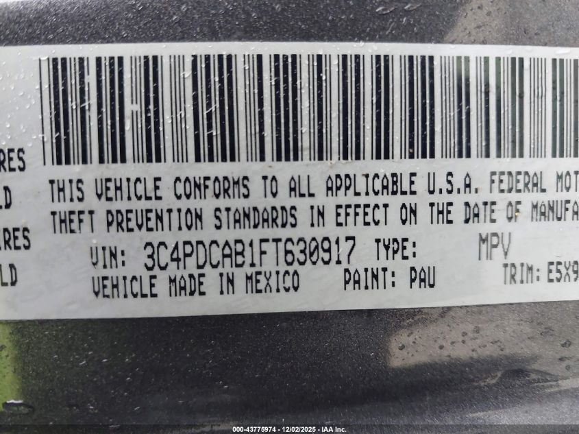 Колір СірийЦиліндри 4Привід Передній привідVIN 3C4PDCAB1FT630917Стан Заводиться та їде (перевірено)Ушкодження Звичайний зносДата аукціону 2025-12-15 AutoRIA
