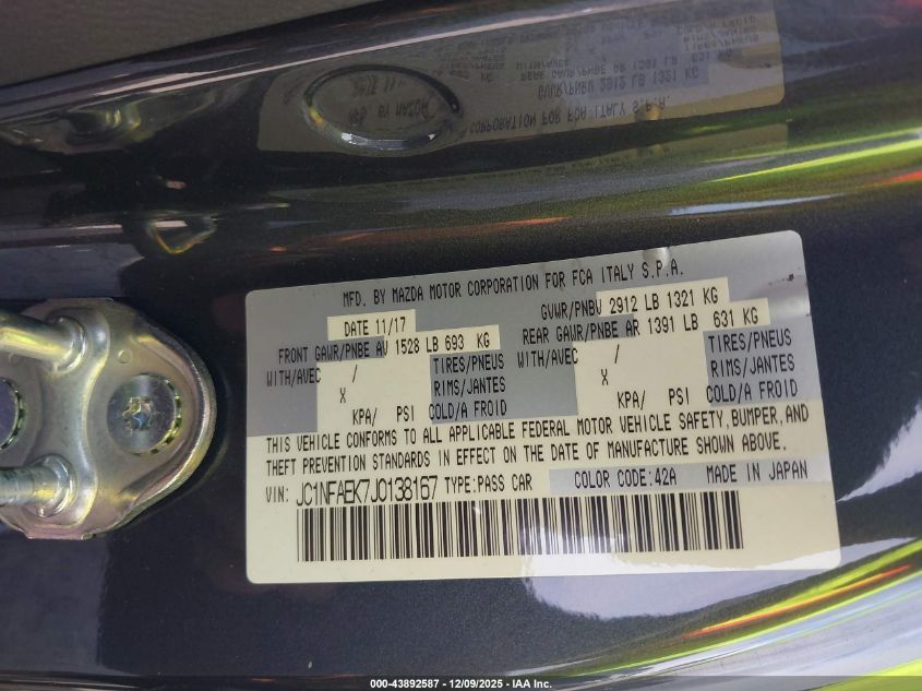 2018 FIAT 124 SPIDER 2018 року Бензин, 1.4, Задній привід, vin - JC1NFAEK7J0138167 з США