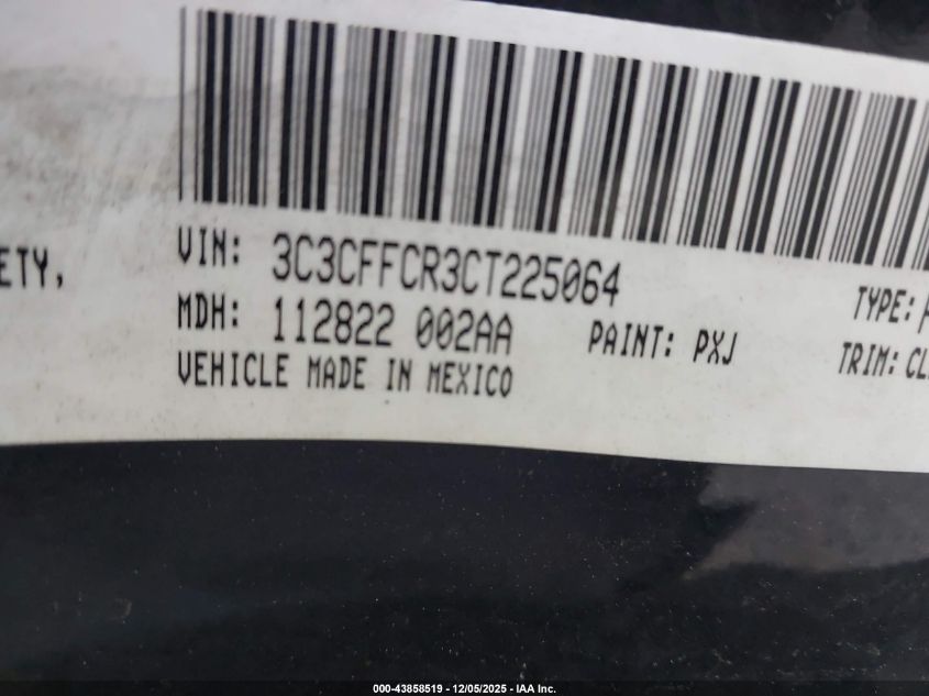 Колір ЧорнийЦиліндри 4Привід Передній привідVIN 3C3CFFCR3CT225064Стан Заводиться та їде (перевірено)Ушкодження Ліва сторонаДата аукціону 2025-12-15 AutoRIA