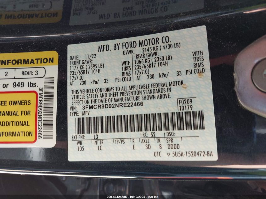 Колір СинійЦиліндри 4Привід Повний привідVIN 3FMCR9D92NRE22466Стан СтаціонарноУшкодження Незначні AutoRIA