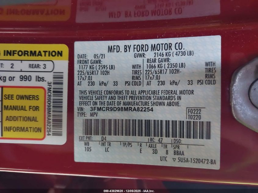 2021 FORD BRONCO SPORT 2021 року Бензин, 2.0, Повний привід, vin - 3FMCR9D98MRA82254 з США
