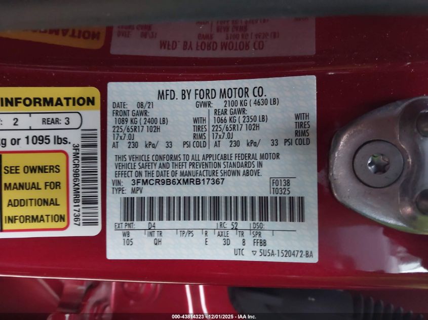 2021 FORD BRONCO SPORT 2021 року Бензин, 1.5, Повний привід, vin - 3FMCR9B6XMRB17367 з США