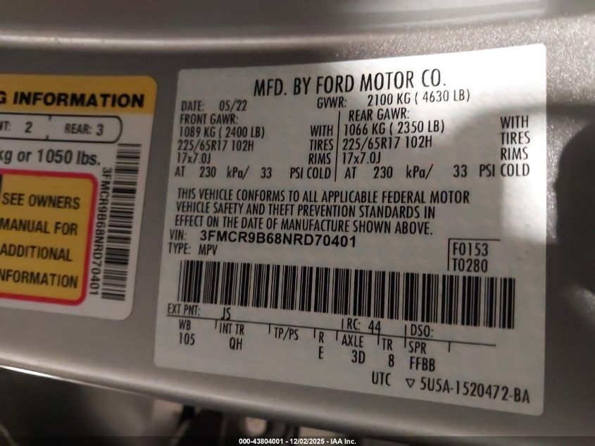 Колір СрібнийЦиліндри 3Привід Повний привідVIN 3FMCR9B68NRD70401Стан Заводиться та їде (перевірено)Ушкодження Передня або задняДата аукціону 2025-12-09 AutoRIA
