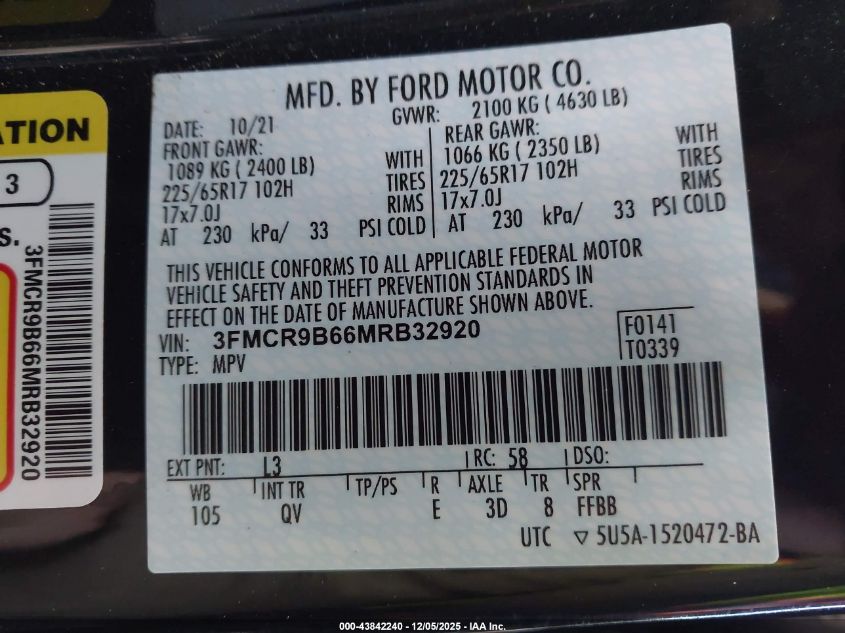 2021 FORD BRONCO SPORT 2021 року Бензин, 1.5, Повний привід, vin - 3FMCR9B66MRB32920 з США