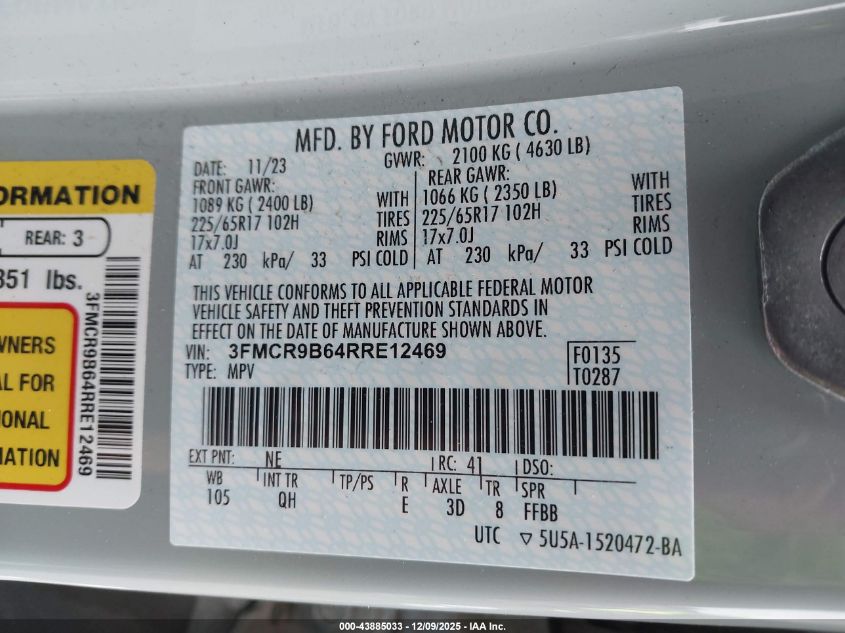 2024 FORD BRONCO SPORT 2024 року Бензин, 1.5, Повний привід, vin - 3FMCR9B64RRE12469 з США