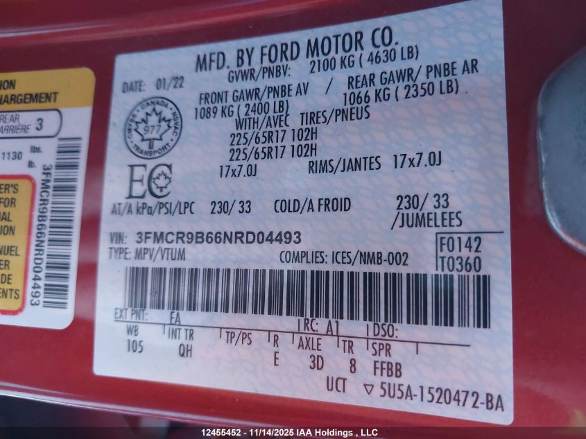 2022 FORD BRONCO SPORT 2022 року Бензин, , Повний привід, vin - 3FMCR9B66NRD04493 з США