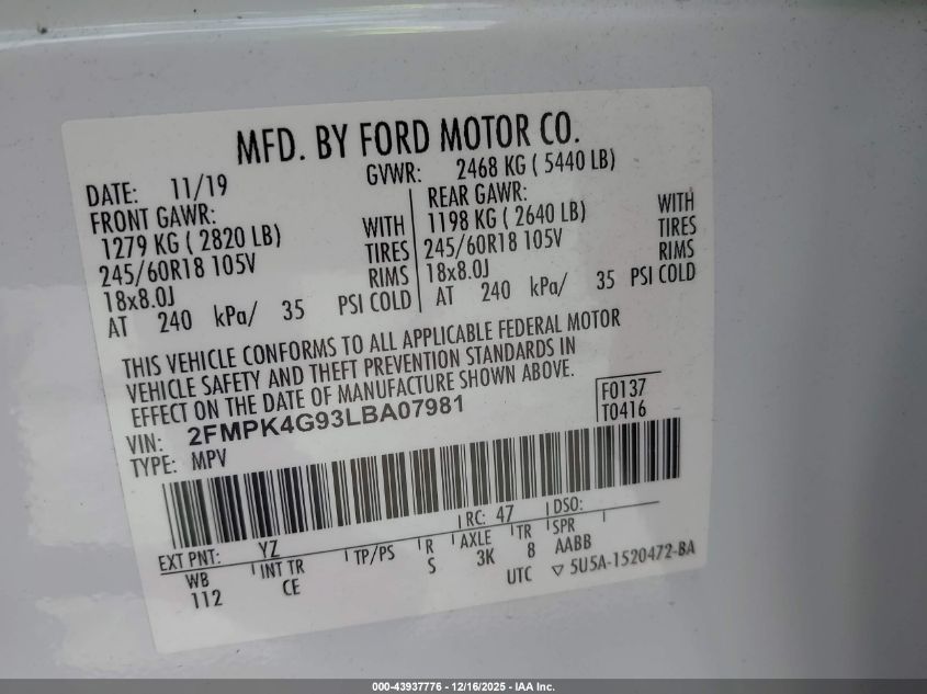 Колір БілийЦиліндри 4Привід Повний привідVIN 2FMPK4G93LBA07981Стан Заводиться та їде (перевірено)Ушкодження Передня або задня AutoRIA
