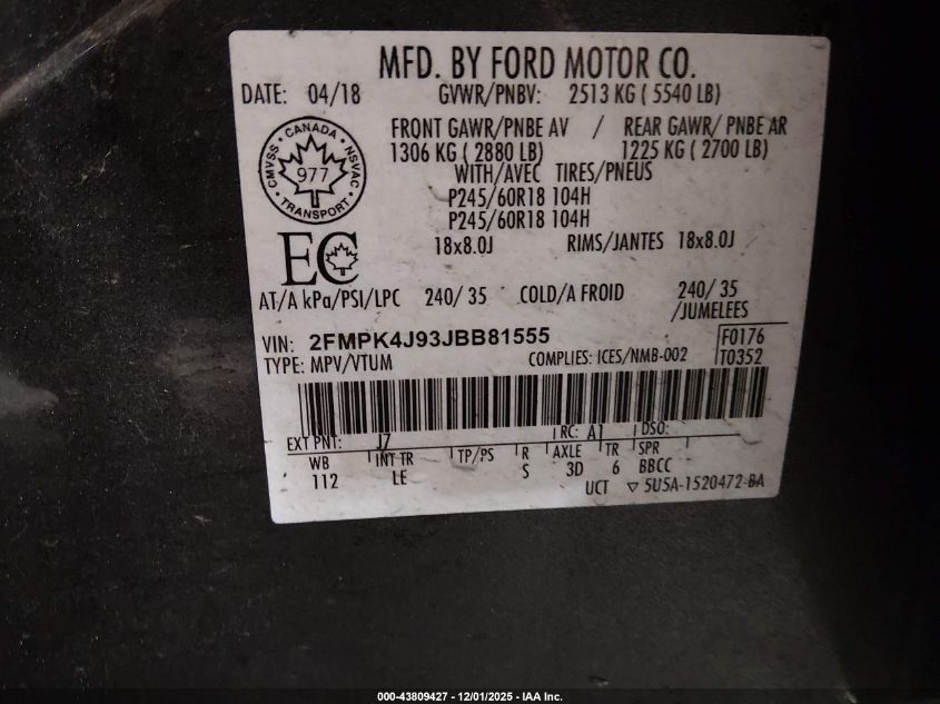 Колір СірийЦиліндри 4Привід Повний привідVIN 2FMPK4J93JBB81555Стан СтаціонарноУшкодження Передня або задня AutoRIA