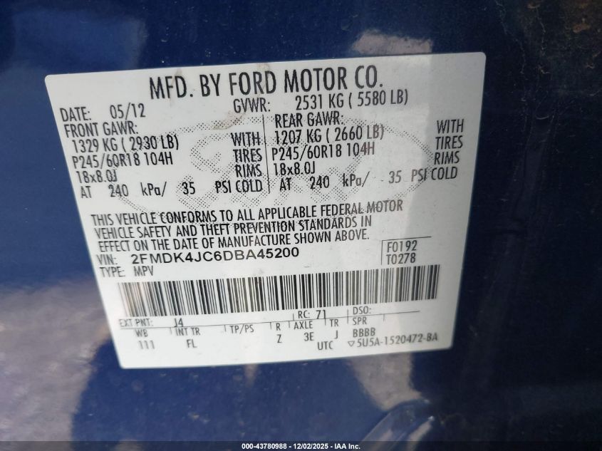 Колір СинійЦиліндри 6Привід Повний привідVIN 2FMDK4JC6DBA45200Стан Заводиться та їде (перевірено)Ушкодження Передня права AutoRIA