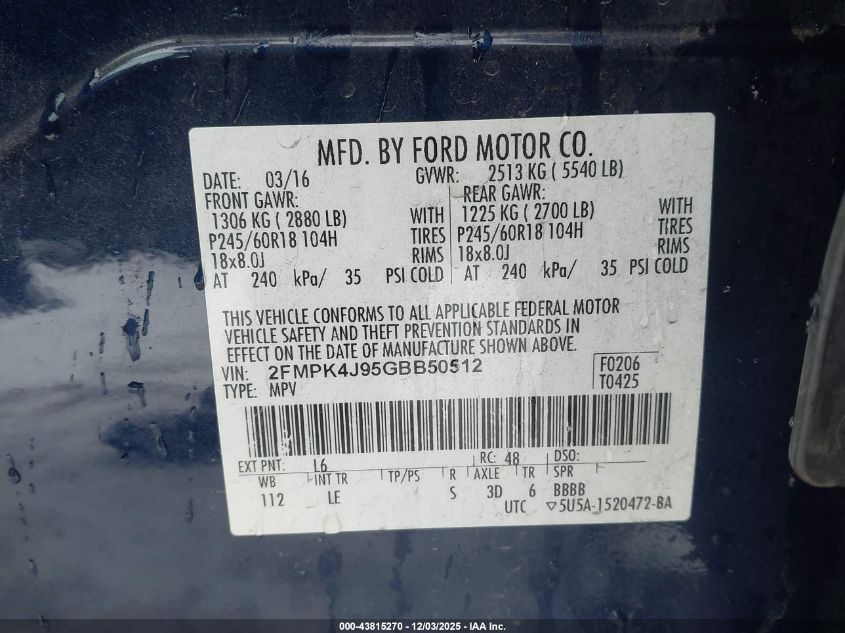 Колір СинійЦиліндри 4Привід Повний привідVIN 2FMPK4J95GBB50512Стан Заводиться та їде (перевірено)Ушкодження Передня або задня AutoRIA