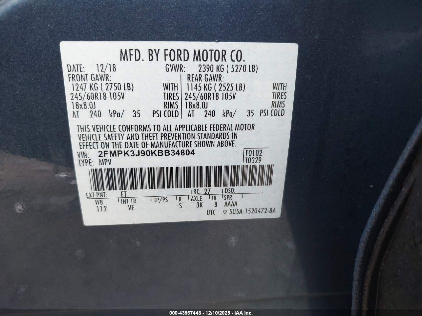 2019 FORD EDGE 2019 року Бензин, 2.0, Передній привід, vin - 2FMPK3J90KBB34804 з США
