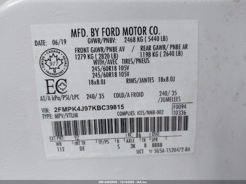 2019 FORD EDGE 2019 року Бензин, 2.0, Повний привід, vin - 2FMPK4J97KBC39815 з США