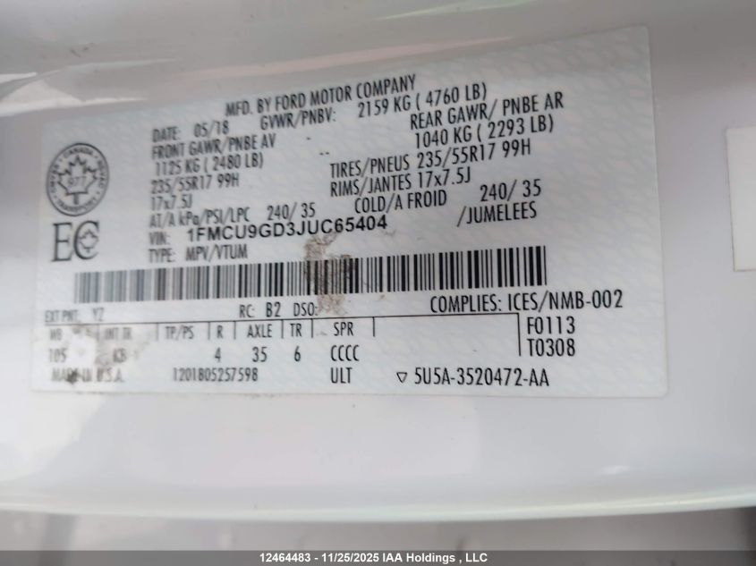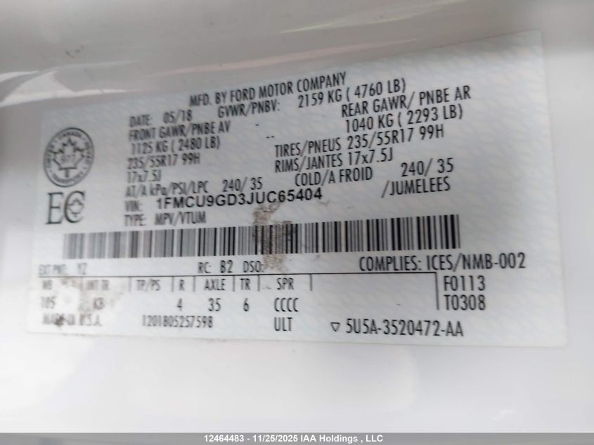 Колір БілийЦиліндри 4Привід Повний привідVIN 1FMCU9GD3JUC65404Стан Заводиться та їде (перевірено)Ушкодження Ліва сторонаДата аукціону 2025-12-17 AutoRIA