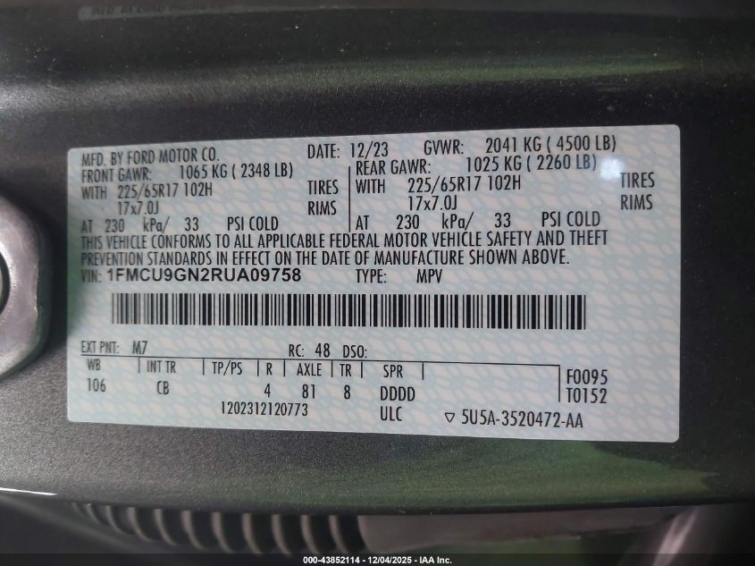 2024 FORD ESCAPE 2024 року Бензин, 1.5, Повний привід, vin - 1FMCU9GN2RUA09758 з США