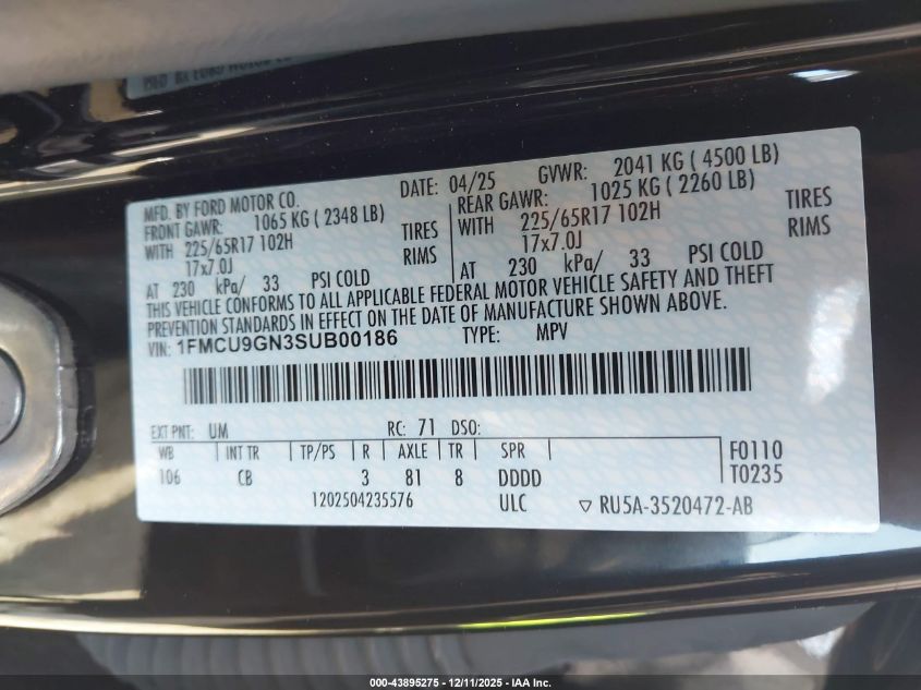 2025 FORD ESCAPE 2025 року Бензин, 1.5, Повний привід, vin - 1FMCU9GN3SUB00186 з США