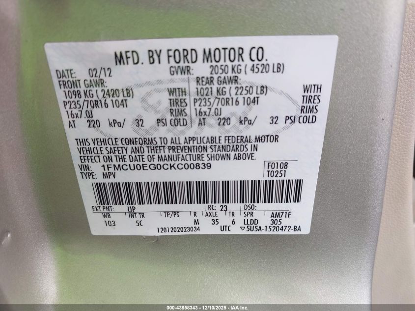 2012 FORD ESCAPE 2012 року Бензин, 3.0, Передній привід, vin - 1FMCU0EG0CKC00839 з США