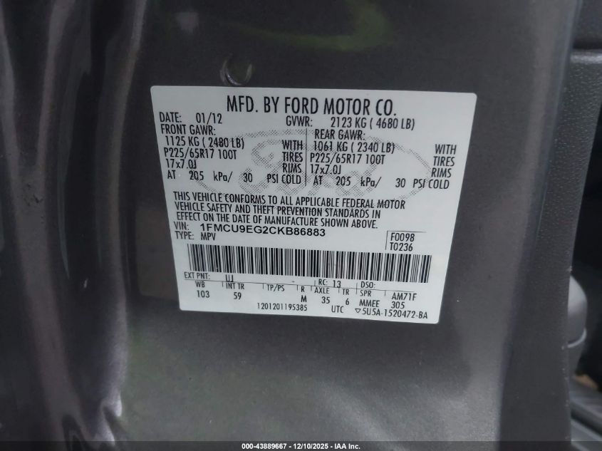 2012 FORD ESCAPE 2012 року Бензин, 3.0, Повний привід, vin - 1FMCU9EG2CKB86883 з США