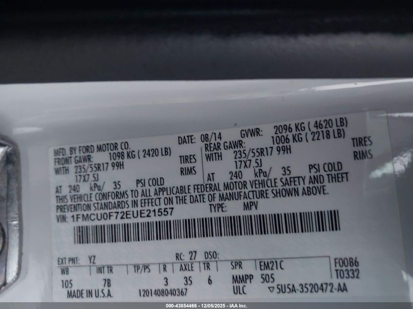 Колір БілийЦиліндри 4Привід Передній привідVIN 1FMCU0F72EUE21557Стан Заводиться та їде (перевірено)Ушкодження Передня права AutoRIA