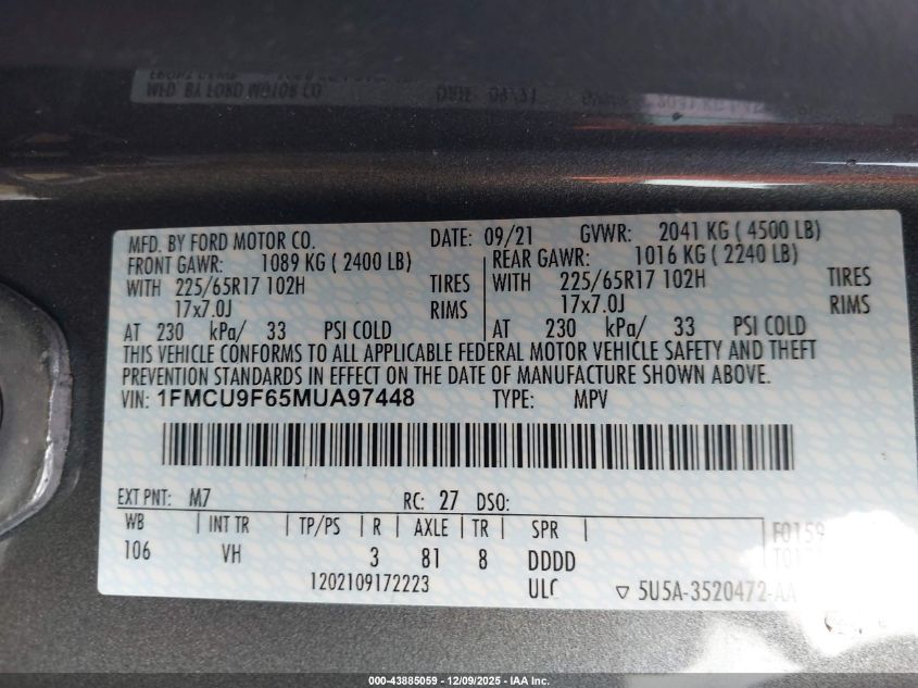 2021 FORD ESCAPE 2021 року Бензин, 1.5, Повний привід, vin - 1FMCU9F65MUA97448 з США