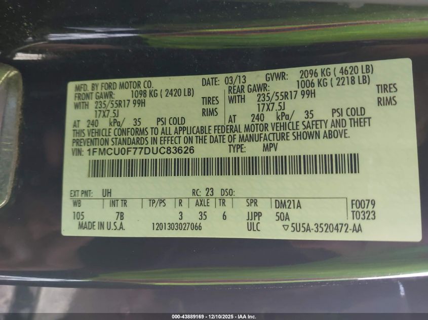 Колір ЧорнийЦиліндри 4Привід Передній привідVIN 1FMCU0F77DUC83626Стан СтаціонарноУшкодження Передня або задня AutoRIA