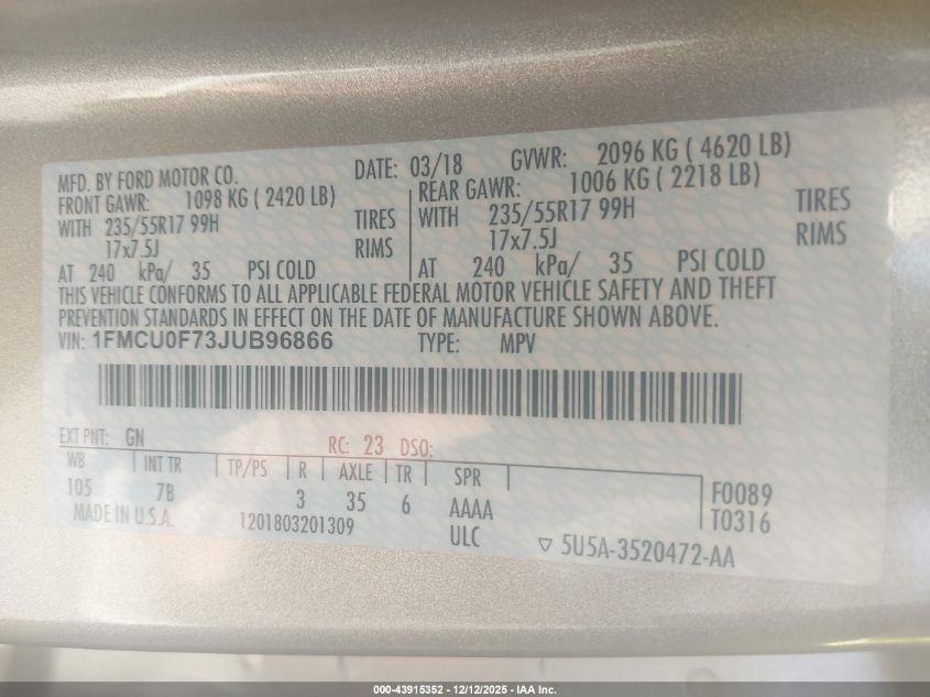 Колір БежевийЦиліндри 4Привід Передній привідVIN 1FMCU0F73JUB96866Стан Заводиться та їде (перевірено)Ушкодження Передня права AutoRIA
