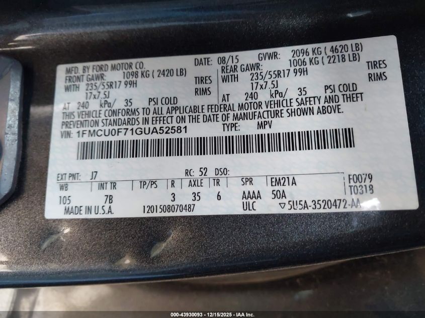 2016 FORD ESCAPE 2016 року Бензин, 2.5, Передній привід, vin - 1FMCU0F71GUA52581 з США