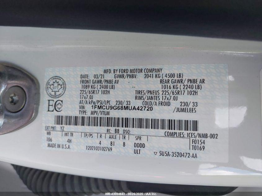 2021 FORD ESCAPE 2021 року Бензин, 1.5, Повний привід, vin - 1FMCU9G68MUA42720 з США
