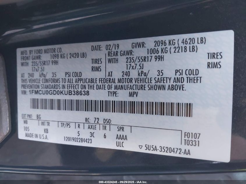 Колір СірийЦиліндри 4Привід Передній привідVIN 1FMCU0GD0KUB38638Стан Заводиться та їде (перевірено)Ушкодження Передня права AutoRIA