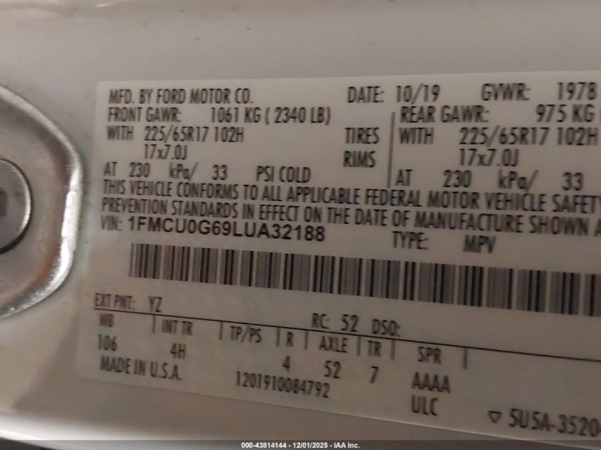 2020 FORD ESCAPE 2020 року Бензин, 1.5, Передній привід, vin - 1FMCU0G69LUA32188 з США