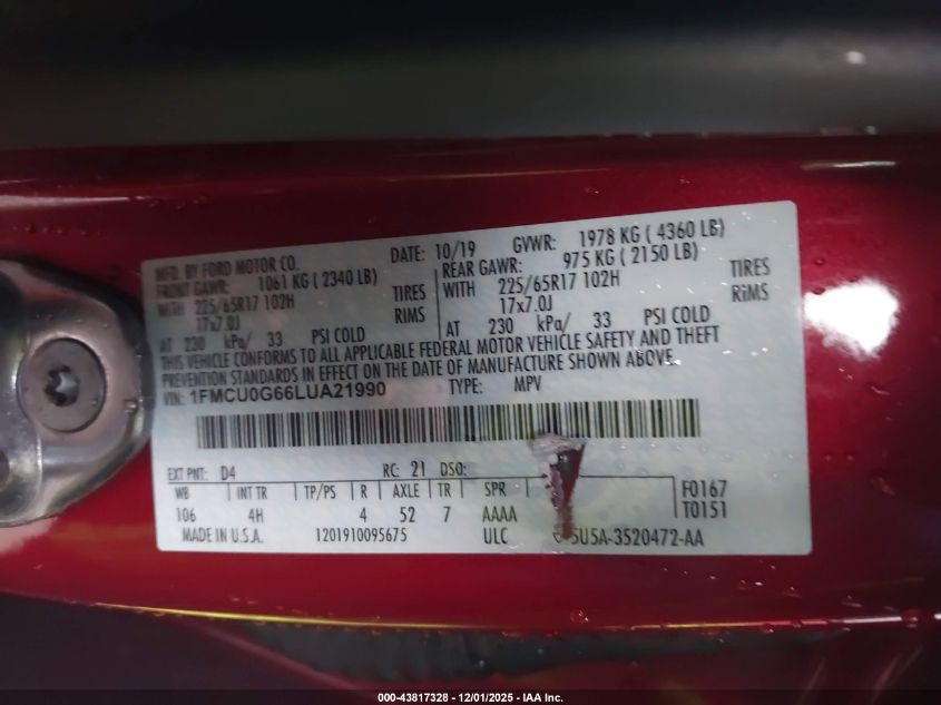 Колір ЧервонийЦиліндри 3Привід Передній привідVIN 1FMCU0G66LUA21990Стан СтаціонарноУшкодження Передня ліва AutoRIA