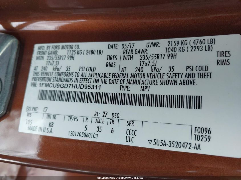 2017 FORD ESCAPE 2017 року Бензин, 1.5, Повний привід, vin - 1FMCU9GD7HUD95311 з США