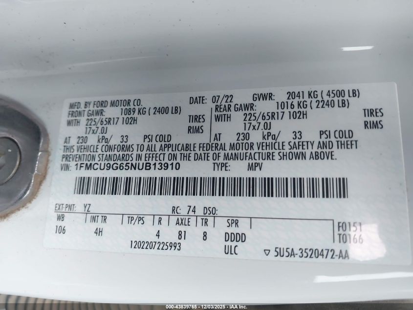 Колір БілийЦиліндри 3Привід Повний привідVIN 1FMCU9G65NUB13910Стан Заводиться та їде (перевірено)Ушкодження Передня права AutoRIA