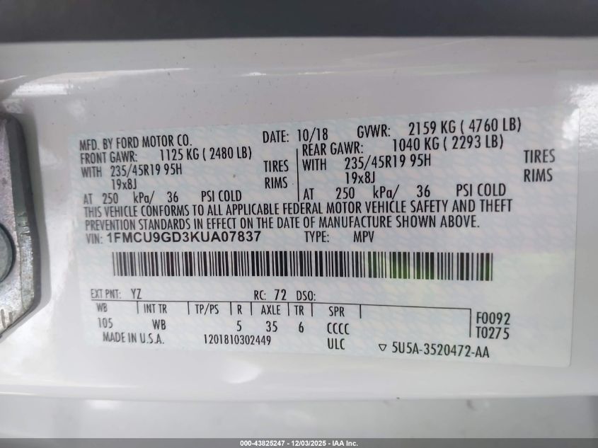 2019 FORD ESCAPE 2019 року Бензин, 1.5, Повний привід, vin - 1FMCU9GD3KUA07837 з США