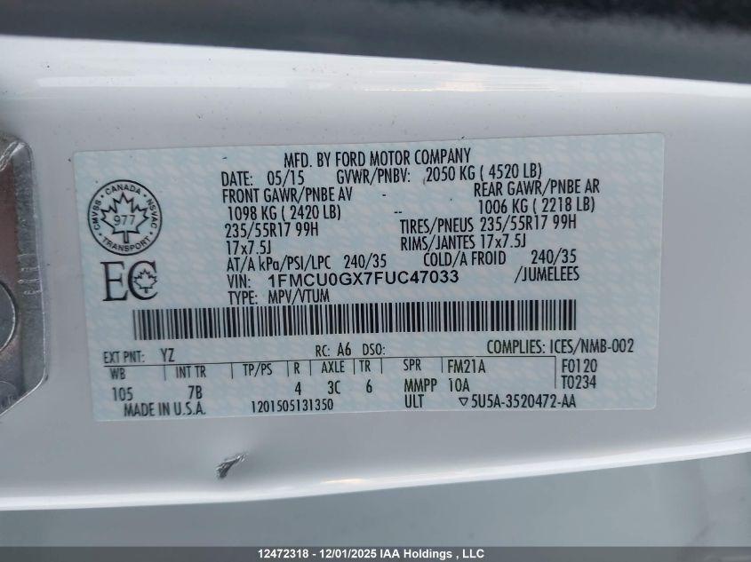 Колір БілийЦиліндри 4Привід Передній привідVIN 1FMCU0GX7FUC47033Стан Заводиться та їде (перевірено)Ушкодження ГрадДата аукціону 2025-12-08 AutoRIA
