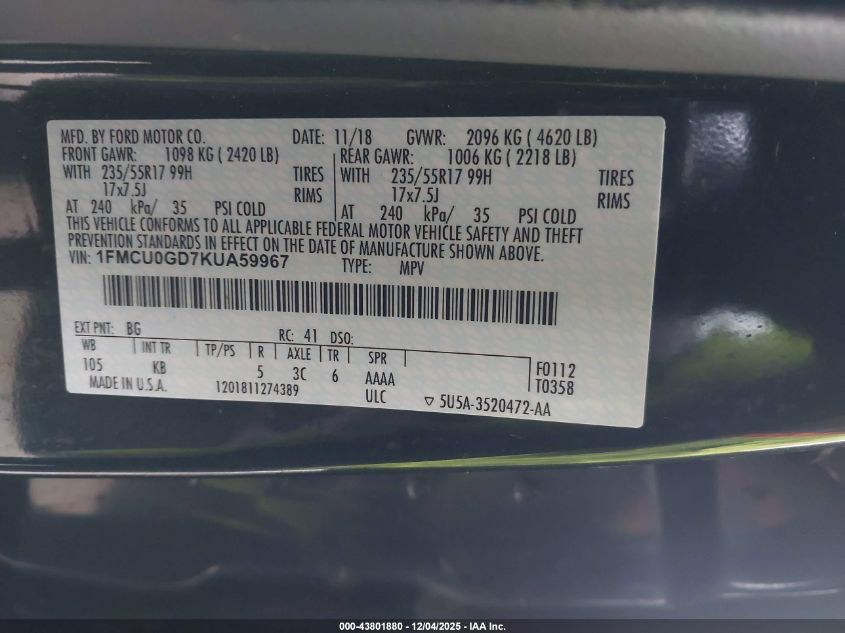 2019 FORD ESCAPE 2019 року Бензин, 1.5, Передній привід, vin - 1FMCU0GD7KUA59967 з США