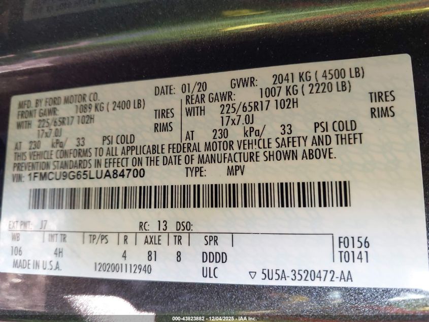 2020 FORD ESCAPE 2020 року Бензин, 1.5, Повний привід, vin - 1FMCU9G65LUA84700 з США