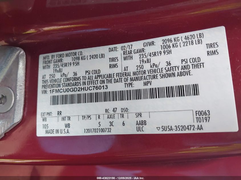 Колір ЧервонийЦиліндри 4Привід Передній привідVIN 1FMCU0GD2HUC76013Стан Заводиться та їде (перевірено)Ушкодження Передня і задня AutoRIA