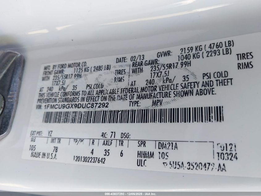 Колір БілийЦиліндри 4Привід Повний привідVIN 1FMCU9GX9DUC87292Стан Заводиться та їде (перевірено)Ушкодження Права сторона AutoRIA