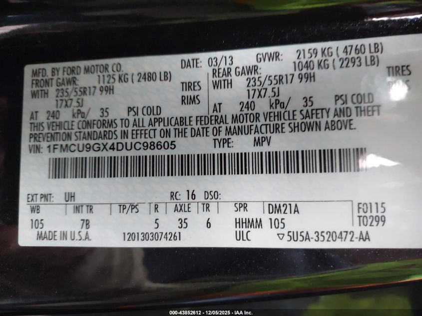 Колір ЧорнийЦиліндри 4Привід Повний привідVIN 1FMCU9GX4DUC98605Стан Заводиться та їде (перевірено)Ушкодження З боків AutoRIA