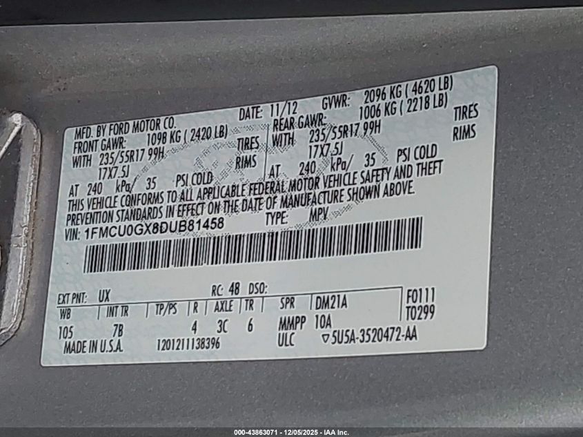 Колір СрібнийЦиліндри 4Привід Передній привідVIN 1FMCU0GX8DUB81458Стан Заводиться та їде (перевірено)Ушкодження Ліва сторона AutoRIA