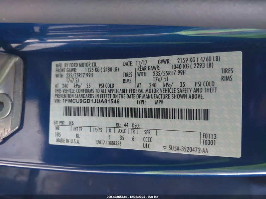 Колір СинійЦиліндри 4Привід Повний привідVIN 1FMCU9GD1JUA81546Стан СтаціонарноУшкодження Передня ліва AutoRIA
