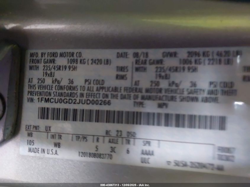 Колір СрібнийЦиліндри 4Привід Передній привідVIN 1FMCU0GD2JUD00266Стан СтаціонарноУшкодження Передня або задня AutoRIA