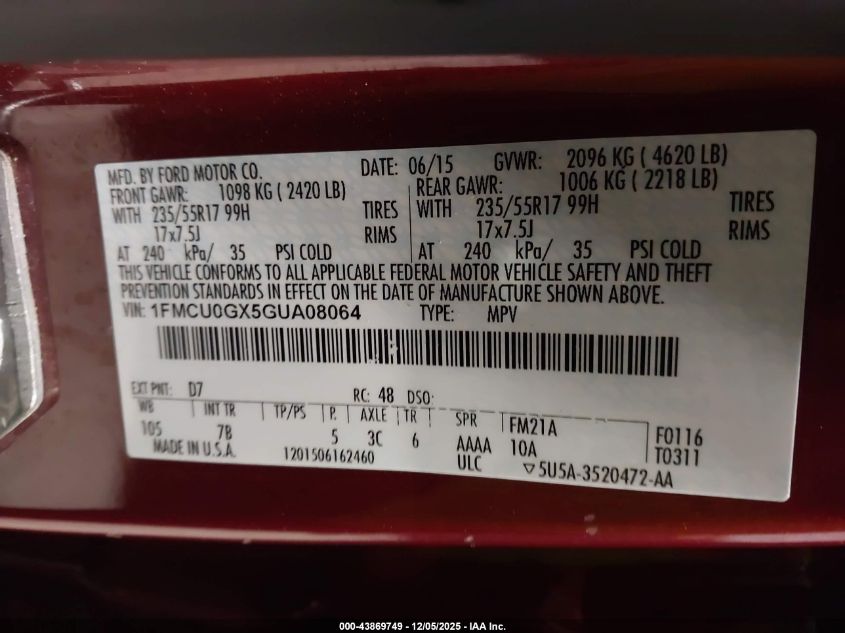 2016 FORD ESCAPE 2016 року Бензин, 1.6, Передній привід, vin - 1FMCU0GX5GUA08064 з США