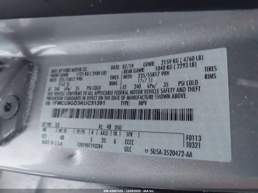 Колір ЗагарЦиліндри 4Привід Повний привідVIN 1FMCU9GD3KUC51391Стан Заводиться та їде (перевірено)Ушкодження Передня ліва AutoRIA