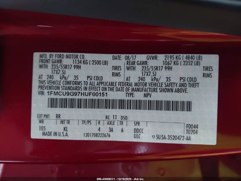 2017 FORD ESCAPE 2017 року Бензин, 2.0, Повний привід, vin - 1FMCU9G97HUF00151 з США