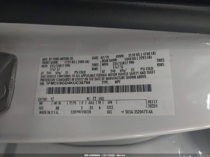 Колір БілийЦиліндри 4Привід Повний привідVIN 1FMCU9GD4KUC36799Стан ЗаводитьсяУшкодження Ліва сторона AutoRIA