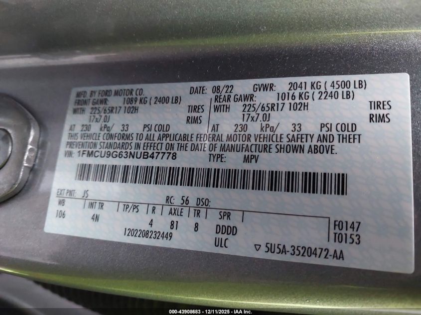 2022 FORD ESCAPE 2022 року Бензин, 1.5, Повний привід, vin - 1FMCU9G63NUB47778 з США