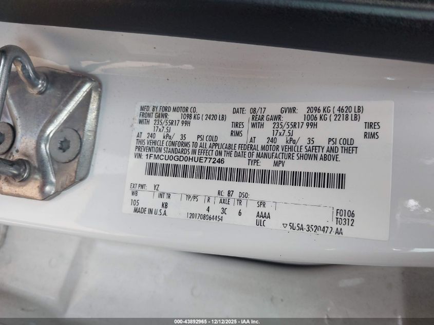 2017 FORD ESCAPE 2017 року Бензин, 1.5, Передній привід, vin - 1FMCU0GD0HUE77246 з США