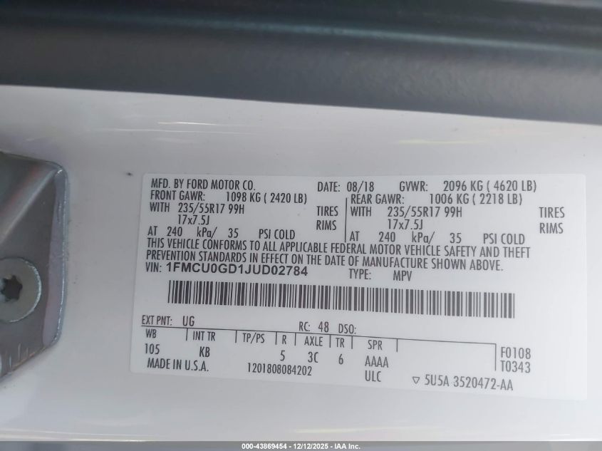 Колір БілийЦиліндри 4Привід Передній привідVIN 1FMCU0GD1JUD02784Стан СтаціонарноУшкодження Передня або задня AutoRIA